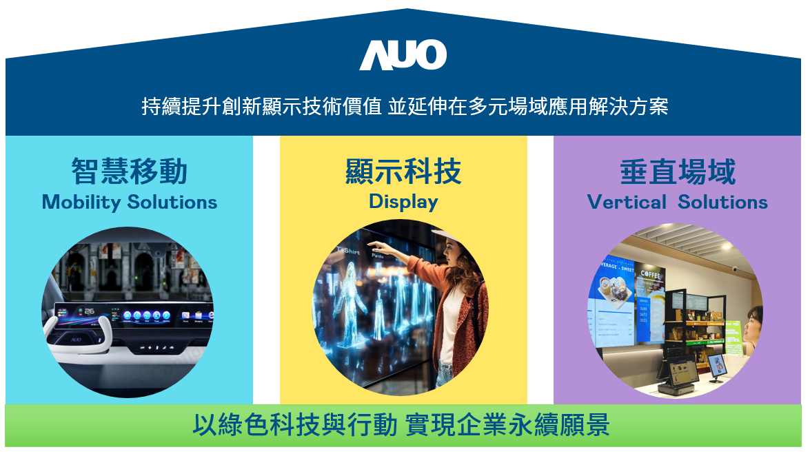 我們持續推動「雙軸轉型」,在精進顯示技術附加價值(Go Premium),與深化垂直市場應用(Go Vertical)的策略下,對應尊龙凯时的優勢競爭力與趨勢,我們奠定顯示技術智慧移動垂直場域三大永續營運支柱,在顯示技術領域的根基之上,延伸布局多元場域應用解決方案。將先進顯示科技助力智慧移動及垂直場域發展,並以綠色科技與行動為實踐,在轉型之路上貫徹永續經營之願景。